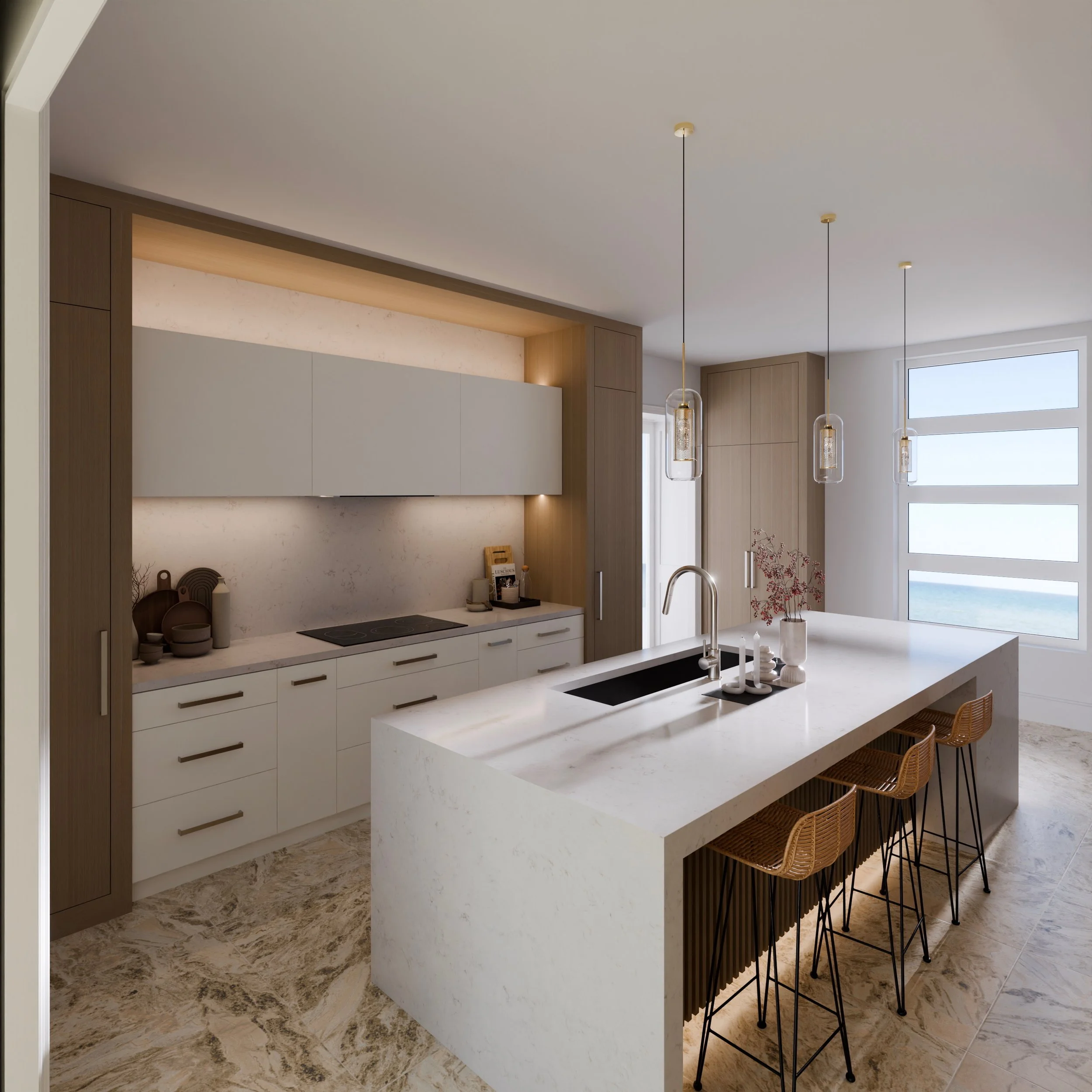 A waterfall marble island, warm wood cabinetry, and soft pendant lighting create a kitchen that’s both modern and inviting.