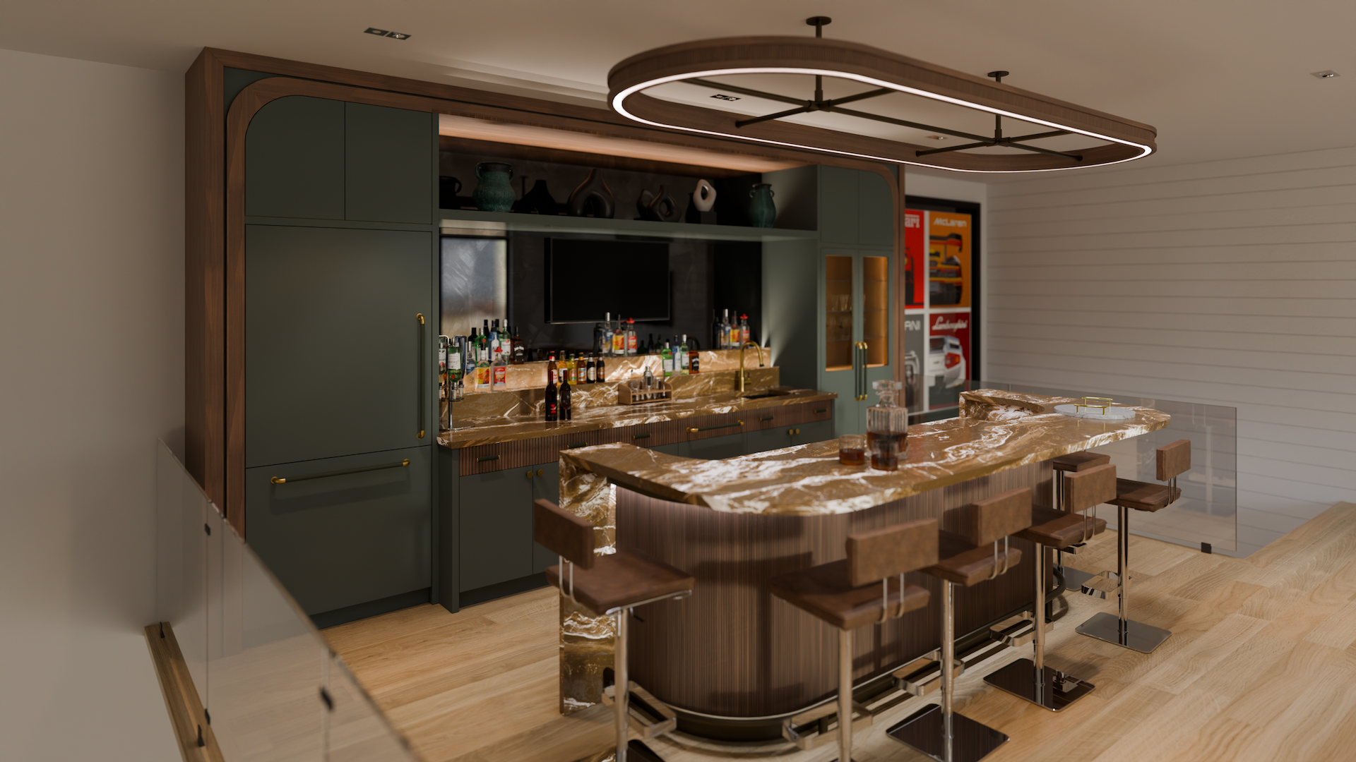 Curved marble, deep green cabinetry, and warm wood textures create a home bar that’s equal parts glam and cozy. With sleek lighting, curated shelves, and a central screen for entertainment.